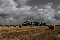 Stroh rollt durch die Landschaft des Brabanter Dorfes Oudemolen in den Niederlanden mit typisch holländischen Wolkenlandschaften.