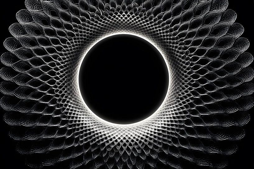 Ein tiefschwarzer Kreis bildet das Zentrum, umgeben von einem komplexen, netzartigen Geflecht aus feinen, leuchtenden Linien. Die Struktur erinnert an eine Mischung aus organischer Zellform und präziser Algorithmik, die sich spiralförmig nach außen entfaltet. Der starke Hell-Dunkel-Kontrast erzeugt Tiefe und Sogwirkung, fast wie ein…