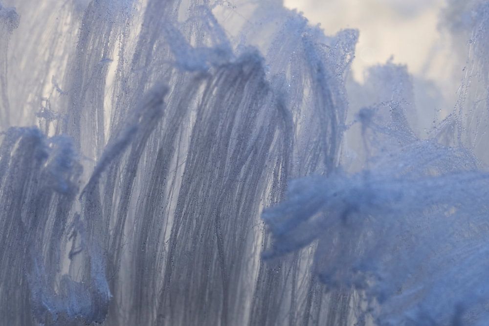 Makroaufnahme der Struktur von Eishaar, auch bekannt als Haareis oder Schneebart. Eishaare bilden sich auf totem Holz, wenn die Temperatur knapp unter dem Gefrierpunkt liegt und die Luftfeuchtigkeit hoch ist. Es handelt sich um nach außen komprimiertes Wasser, das zu einer haarähnlichen Struktur gefriert.