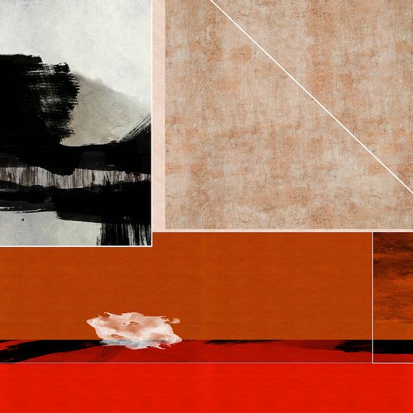 Eine abstrakt expressionistische Komposition in Mischtechnik mit mehreren unterschiedlich strukturierten Bereichen. Der obere linke Quadrant präsentiert sich im Stil eines monochromen Landschaftsgemäldes mit breiten, gestischen Pinselstrichen in Schwarz vor einem gedämpften grauen und cremeweißen Hintergrund. Der obere rechte Bereich…