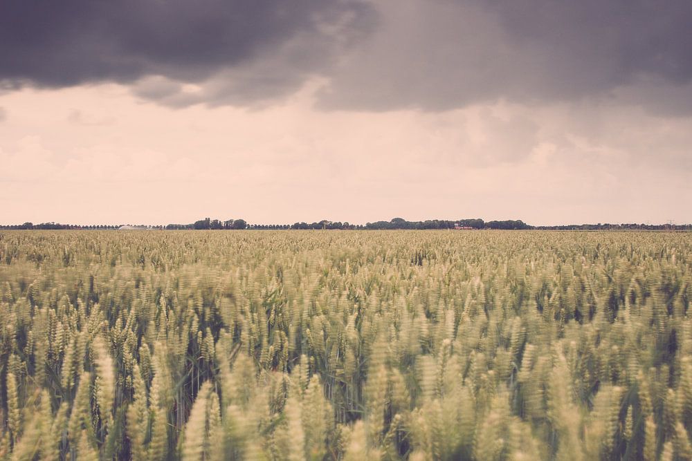 Dunkle bedrohliche Regenwolken, die über die Polderlandschaft schwimmen. Wellenartig bewegendes Korn auf einem landwirtschaftlichen Feld mit Sturmwolken und endlosen Vistas im niederländischen Polder