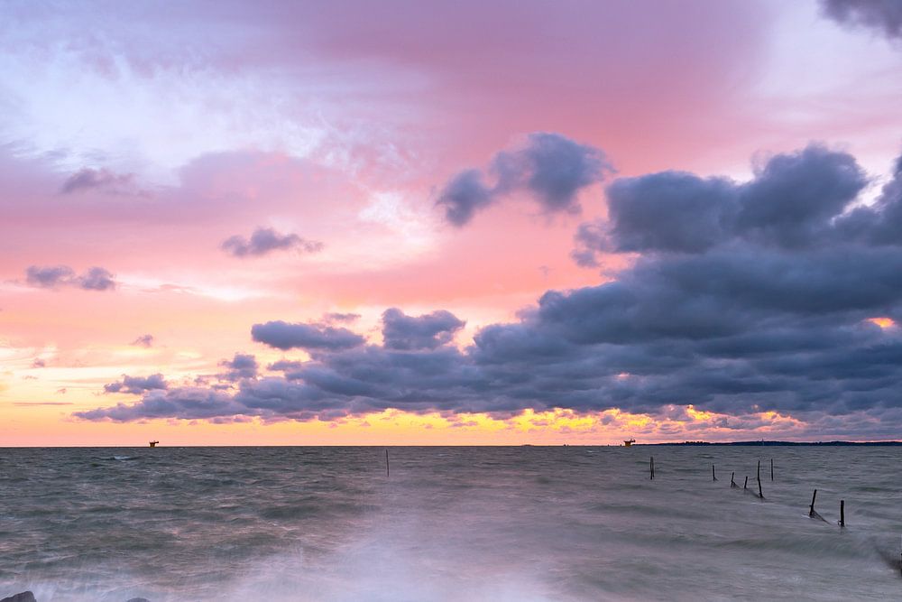 Starke Winde verursachen spritzendes Wasser auf dem Nordostpolderdeich. Der Himmel ist gelb, orange und violett gefärbt von der Sonne, die gerade untergegangen ist.