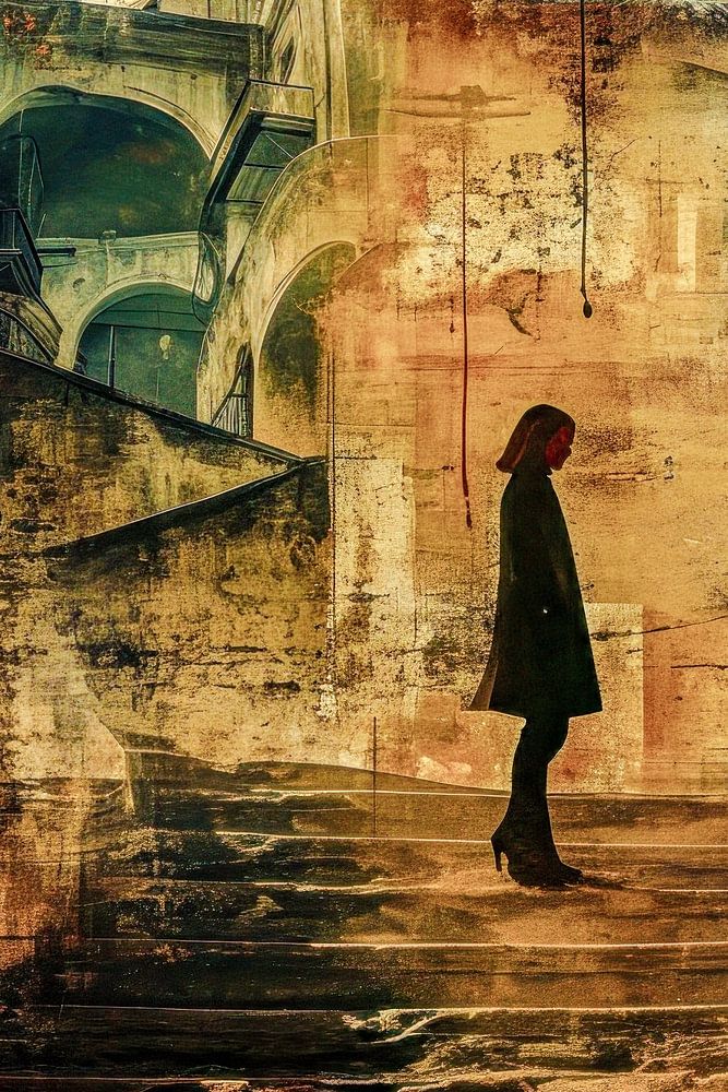 Das Auge könnte als Symbol für übernatürliche oder göttliche Beobachtung gesehen werden, während die Figur unten in den Abgrund der menschlichen Existenz oder in die Geheimnisse der Vergangenheit schreitet. Es scheint, als ob die Person auf dieser Reise etwas Entscheidendes entdeckt oder sich auf ein unergründliches Abenteuer begibt. Die Mischung aus Treppenhaus und urbaner Szenerie fügt eine Tiefe hinzu, die sowohl physisch als auch metaphorisch ist.