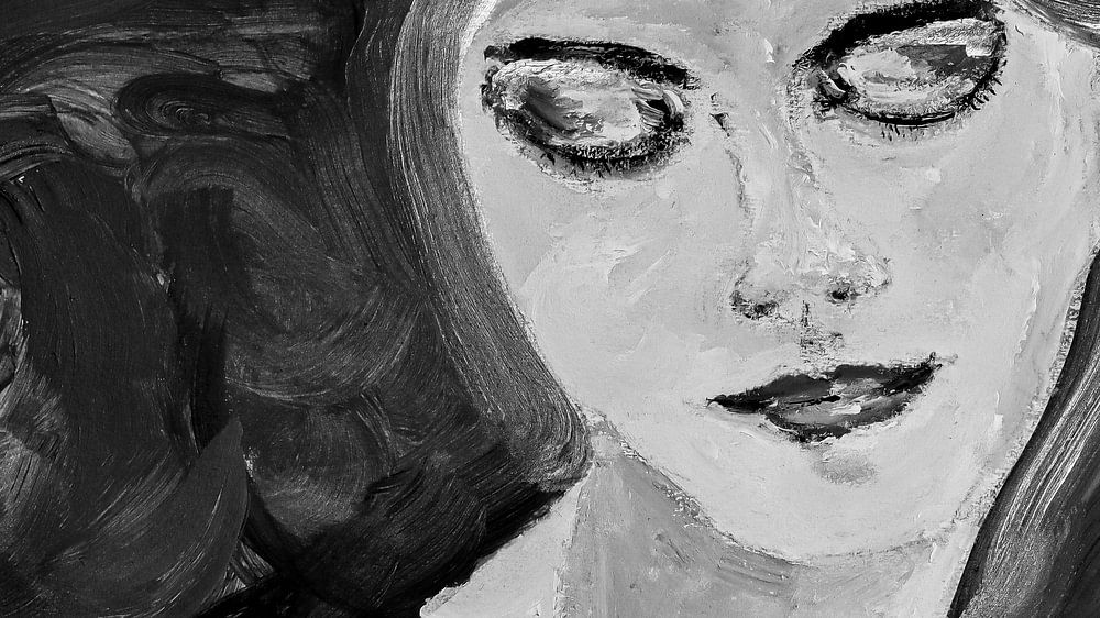 Ein mit Acrylfarbe gemaltes Porträt, achtsam, in sich gekehrt, still und ruhig, in Schwarz und Grau.