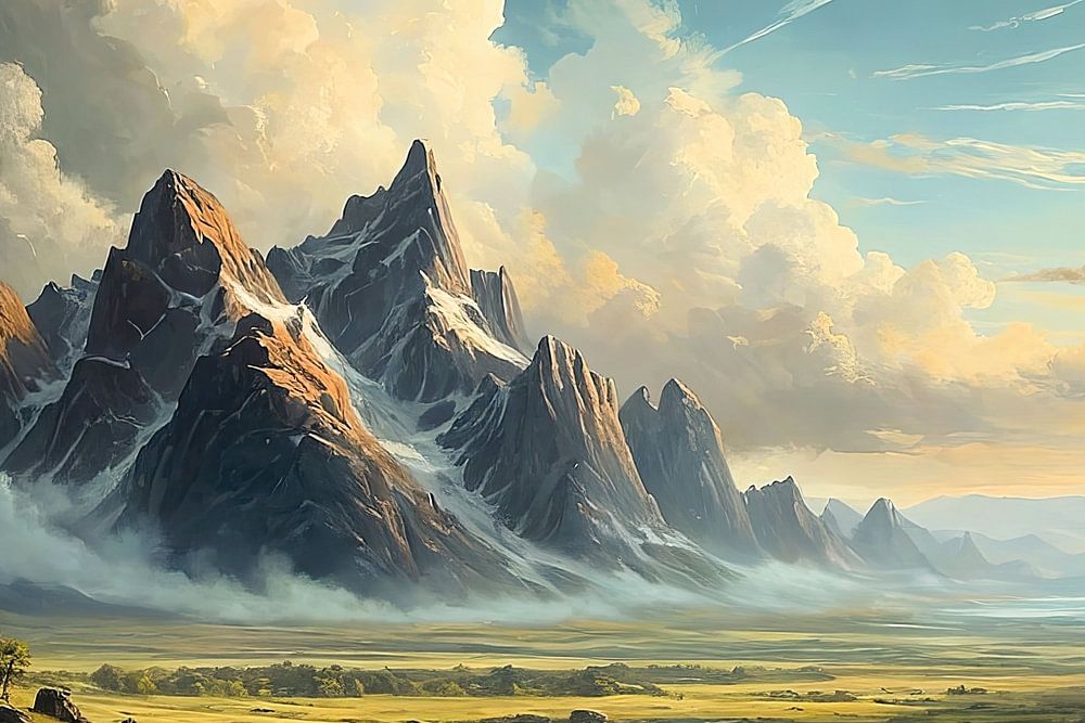 Majestätische, scharf aufragende Bergspitzen durchbrechen die Wolkendecke, während dramatische Lichtstrahlen ihre gezackten Hänge in Gold und Schatten tauchen. Dichter Nebel umspielt die unteren Hänge, als würde sich die Landschaft auf einen herannahenden Sturm vorbereiten. Vor dem Gebirgsmassiv erstreckt sich eine weitläufige, von Wasserläufen durchzogene Ebene, in der sich das Licht des Himmels spiegelt. Die Szenerie vereint monumentale Erhabenheit mit einer greifbaren Spannung – ein Moment, in dem Naturkraft und stille Schönheit aufeinandertreffen.