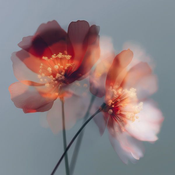 Dieses Werk, „Subtile orangefarbene Anklänge 3“, ist eine moderne Interpretation von Feldblumen. Die Komposition ist minimalistisch und verträumt, mit einem schönen Kontrast zwischen den warmen Orange- und zarten Rosatönen der Blumen und dem kühlen blaugrauen Hintergrund. Die feinen, goldenen Details im Herzen der Blumen setzen einen…