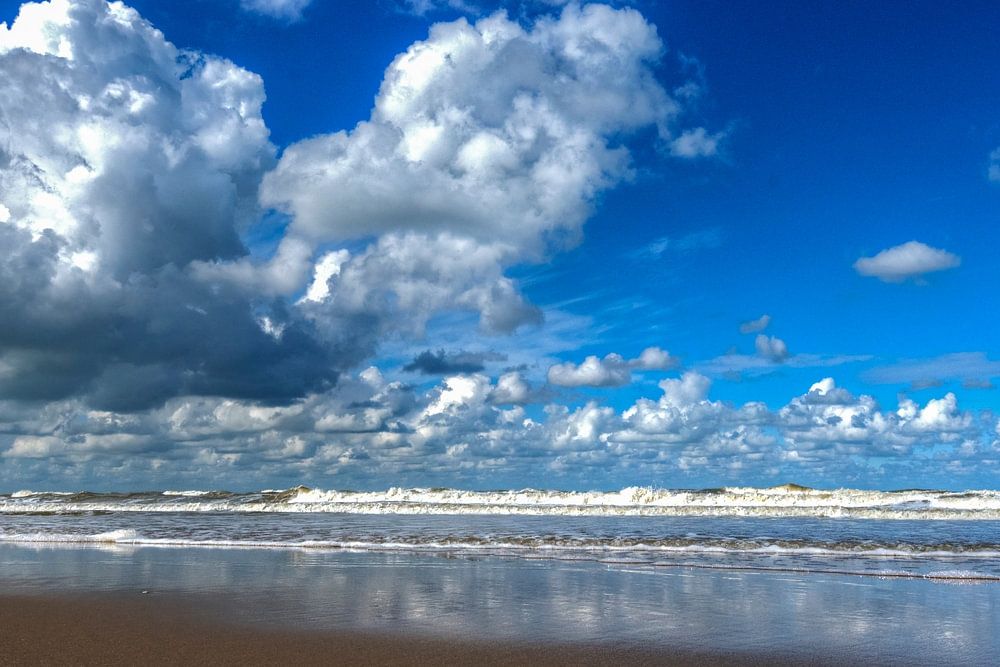 Seine Arbeiten fangen die Ruhe der Nordsee unter einem strahlend blauen Himmel mit weißen Wolken ein.