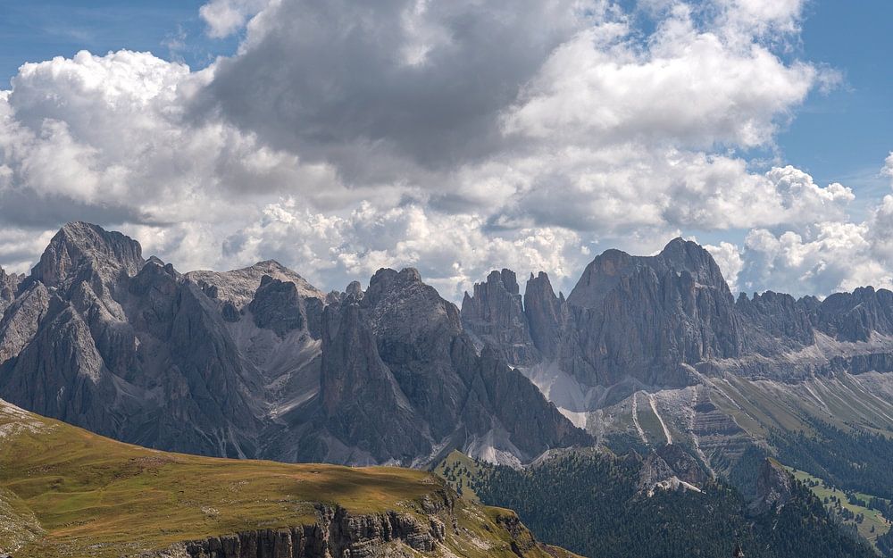 Blick vom Schlern auf die umliegende Berglandschaft in Südtirol, Italien, Europa