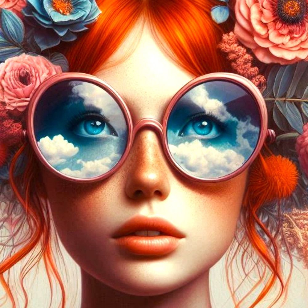Seltsam, schräg, verrückt, das sind einige Worte, die dieses Porträt einer Frau mit roten Haaren und Brille beschreiben. Was für schöne Farben, wie rosa, blau, orange eigentlich zu viele, um sie zu erwähnen. Jeder wird vor Erstaunen stehen bleiben, um zu sehen, was genau vor sich geht.