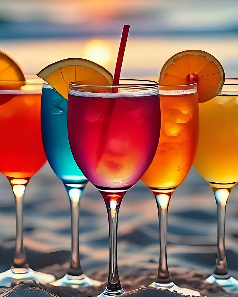 Diese Komposition strahlt eine fröhliche und unbeschwerte Stimmung aus, die den Betrachter auf eine Reise in die Welt der tropischen Genüsse einlädt. Die Kombination aus den bunten Cocktails, dem goldenen Sand und dem malerischen Sonnenuntergang schafft ein harmonisches Bild des Glücks und der Freiheit – eine perfekte Einladung, den Alltag hinter sich zu lassen und den Moment zu genießen. In dieser Szenerie verschmelzen Genuss und Natur zu einem unvergesslichen Erlebnis.