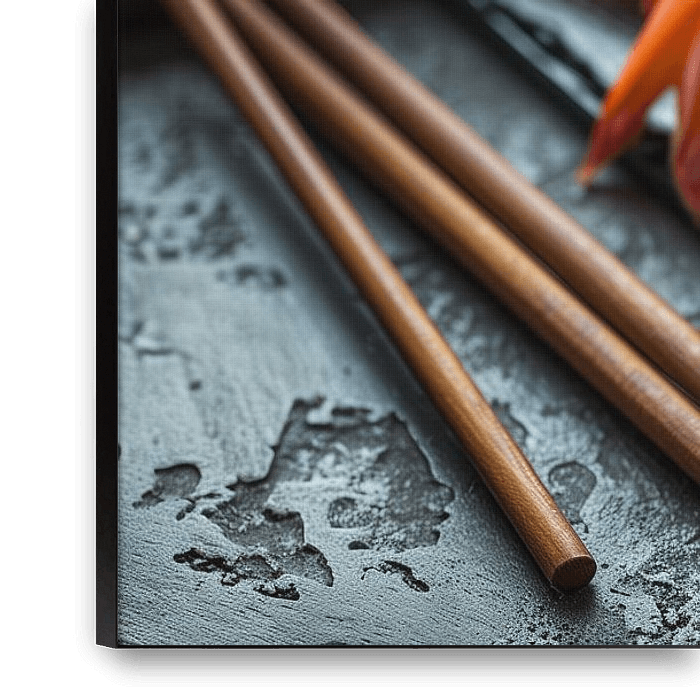 Bestelle das digitale Kunst Bild Suhsi rollen auf einer Platte mit Essstäbchen von de-nue-pic als Reproduktion auf Leinwand, Alu-Dibond, als Poster, Fototapete oder Acrylglasbild.