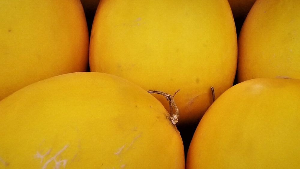 Ein heller und fröhlicher Naturfotodruck, der eine atemberaubende Sammlung von glatten, kanariengelben Melonen zeigt. Das Foto hebt die fast gleichmäßige, leuchtende Farbe und die perfekt abgerundeten, symmetrischen Formen der Früchte hervor. Der leuchtende gelbe Farbton füllt den Rahmen aus und schafft ein kraftvolles, sonniges und sehr chromatisches visuelles Erlebnis. Das Fehlen einer auffälligen Textur lenkt die Aufmerksamkeit ausschließlich auf das kräftige Farbfeld und die sich wiederholende, glatte Form und verleiht dem Bild einen klaren, modernen und minimalistischen abstrakten Charakter. Dieses Kunstwerk eignet sich perfekt, um jedem modernen Interieur, insbesondere Küchen, Essbereichen oder Kinderzimmern, einen klaren, kräftigen Farbklecks und Wärme zu verleihen. Es verkörpert einfache, wirkungsvolle Lebensmittelkunst und ist eine großartige Wahl sowohl für Wandkunst als auch für helle Print-on-Demand-Accessoires.