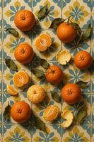 In dieser köstlichen Komposition liegen saftige Clementinen - teilweise geschält und spielerisch verstreut - auf einem bunten Muster aus Retro-Fliesen. Die warmen Orangetöne heben sich wunderbar von dem blau-gelben Vintage-Hintergrund ab und verleihen dem Bild ein mediterranes Flair.