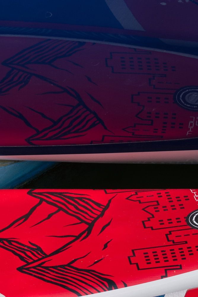 Zwei Surfbretter schwimmen neben dem Rumpf eines Segelschiffs und spiegeln sich darin. Ein Bild des Wassers, des Sports, aber auch einfach die geschwungenen Linien der Bretter, die sich im Rumpf spiegeln und verzerren, und die geschwungenen Linien des Rumpfes selbst. Ein weiteres Detailbild, dessen Teile zwar erkennbar, aber Teil des Ganzen sind, dem es entnommen wurde, und das daher etwas Besonderes erhält. Ein Teil der Wirklichkeit in Form und Farbe.