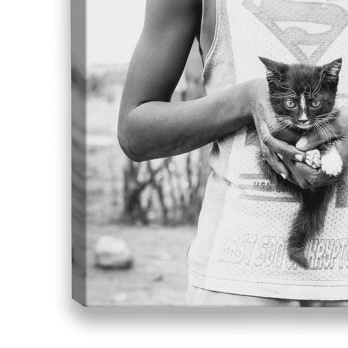 Schwarzweißaufnahme eines tansanischen Jungen mit Superman-T-Shirt und einer Katze in der Hand
