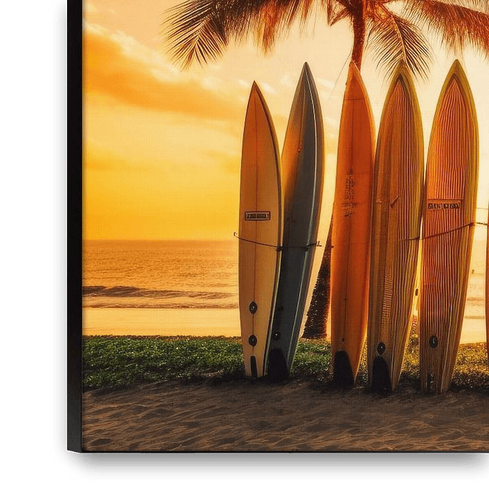 Eine Reihe von Surfbrettern ist am Strand aufgereiht, mit Blick auf das Meer. Es sieht so aus, als ob die Surfbretter auf ihre Surfer warten, bereit, die Wellen zu bezwingen und das ultimative Surferlebnis zu bieten. Die untergehende Sonne wirft ein warmes, orangefarbenes Licht auf den Strand und das Meer, während die ruhigen Wellen…