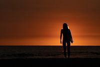 Ein surfendes Mädchen mit ihrem Surfbrett an einem Strand in Hawaii, als Silhouette gegen die untergehende Sonne.