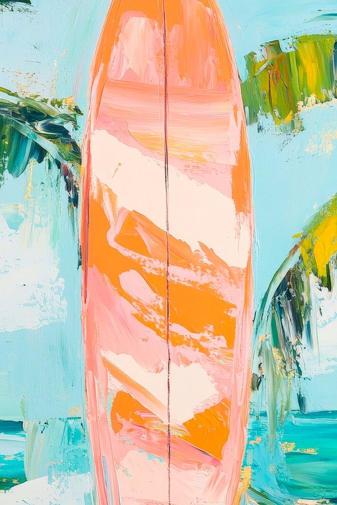 Tropische Träume erwachen! Eine leuchtend orangefarbene Surfbretter thront zwischen sanften Palmen, umgeben von strahlend blauem Himmel und glitzerndem Wasser. Diese lebendige Szenerie versprüht Lebensfreude und Abenteuerlust. Perfekt für ein Wohnzimmer oder ein Freizeitzimmer, bringt sie Urlaubsstimmung direkt nach Hause und lädt zum Entspannen ein.