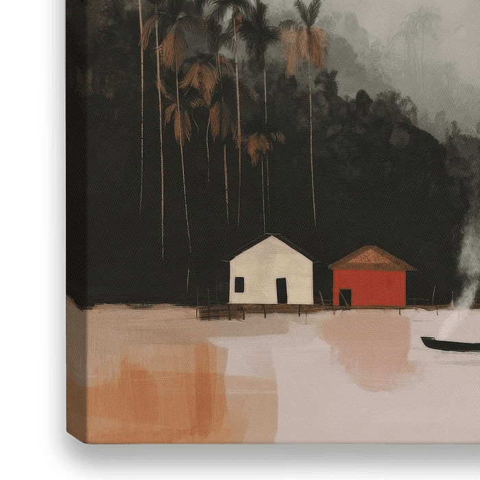 Dieses stimmungsvolle Kunstwerk fängt die heitere Schönheit des surinamischen Flusslebens ein. Die farbenfrohen Häuschen am Ufer, umgeben von sich wiegenden Palmen und sanftem Nebel über dem Regenwald, strahlen Ruhe und Authentizität aus. Auf dem Fluss gleiten traditionelle Boote vorbei, ein subtiler Hinweis auf das tägliche Leben, das…