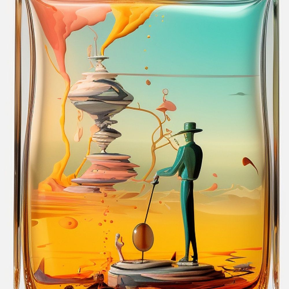 In einer eleganten, rechteckigen Glasflasche mit goldenem Verschluss entfaltet sich eine surreale Landschaft. Ein stilisierter Mann in einem grünen Anzug und Hut steht auf einer kleinen, felsigen Insel und hält einen Stock zu einer schwebenden, orangefarbenen Kugel. Im Hintergrund erheben sich bizarre, geschichtete Felsformationen unter einem Himmel, der von Orange zu Türkisblau verläuft. Die Flüssigkeit in der Flasche scheint Teil dieser Traumwelt zu sein. Die Szene wirkt wie ein eingefangener Augenblick aus einem phantastischen Gemälde, geheimnisvoll und ein wenig melancholisch.