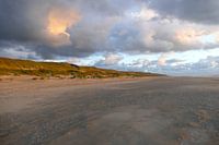 Die Beleuchtung durch die untergehende Sonne erzeugt eine fast surreale Ansicht des breiten Strandes mit den Sanddünen am Paal 15.