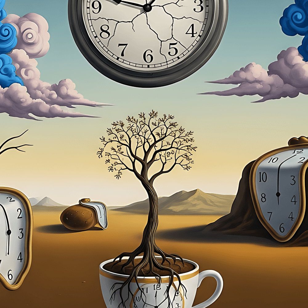 Treten Sie mit diesem surrealistischen digitalen Gemälde in eine Welt jenseits der Logik ein. Mit schwebenden Inseln, schmelzenden Uhren und ätherischen Figuren, die aus dem Nebel auftauchen, fängt dieses Werk die Essenz von traumhafter Vorstellungskraft und unterbewusster Fantasie ein. Perfekt für Kunstliebhaber, die surreale Traumlandschaften, konzeptionelle Visualisierungen und von der Fantasie inspirierte Kunstwerke lieben.