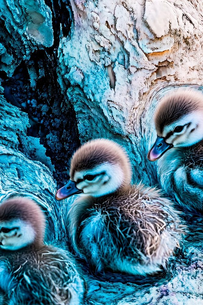 Dieses einzigartige Design zeigt drei niedliche Entenküken, die sich in einer surrealen Landschaft mit leuchtenden Farben und Texturen ausruhen. Der Kontrast zwischen den weichen, flauschigen Tieren und dem abstrakten, gewellten Hintergrund macht dieses Bild faszinierend und auffällig. Es eignet sich perfekt als Blickfang für Ihr Interieur, sei es in einem Schlafzimmer oder einem Hobbyraum. Die Farbkomposition aus Blau und Beige strahlt Ruhe aus, während die surrealen Elemente einen Hauch von Geheimnis hinzufügen. Ein wunderschönes Dekorationsstück für Tierliebhaber und Kunstbegeisterte.