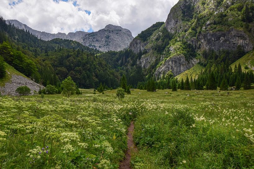 Der blühende Talboden der Suva Jezerina im Naturpark Piva in Montenegro, nahe der Grenze zu Bosnien und Herzegowina.