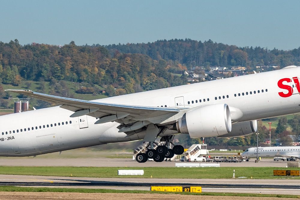 Eine Boeing 777-300 der Swiss International Air Lines (HB-JNA) hebt vom Flughafen Zürich ab.