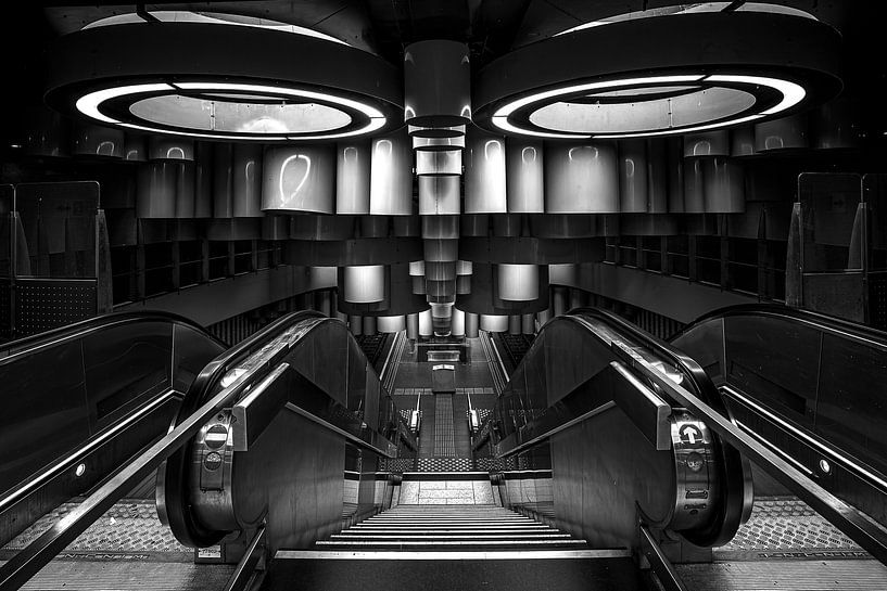 Ein kraftvolles Schwarz-Weiß-Bild, das Symmetrie, Architektur und Bewegung kombiniert. Die klaren Linien und die Wiederholung der Formen schaffen einen grafischen und modernen Look. Dieser Kunstdruck passt perfekt in ein modernes, industrielles oder minimalistisches Interieur und setzt ein starkes Zeichen in Wohn- oder Arbeitsräumen.