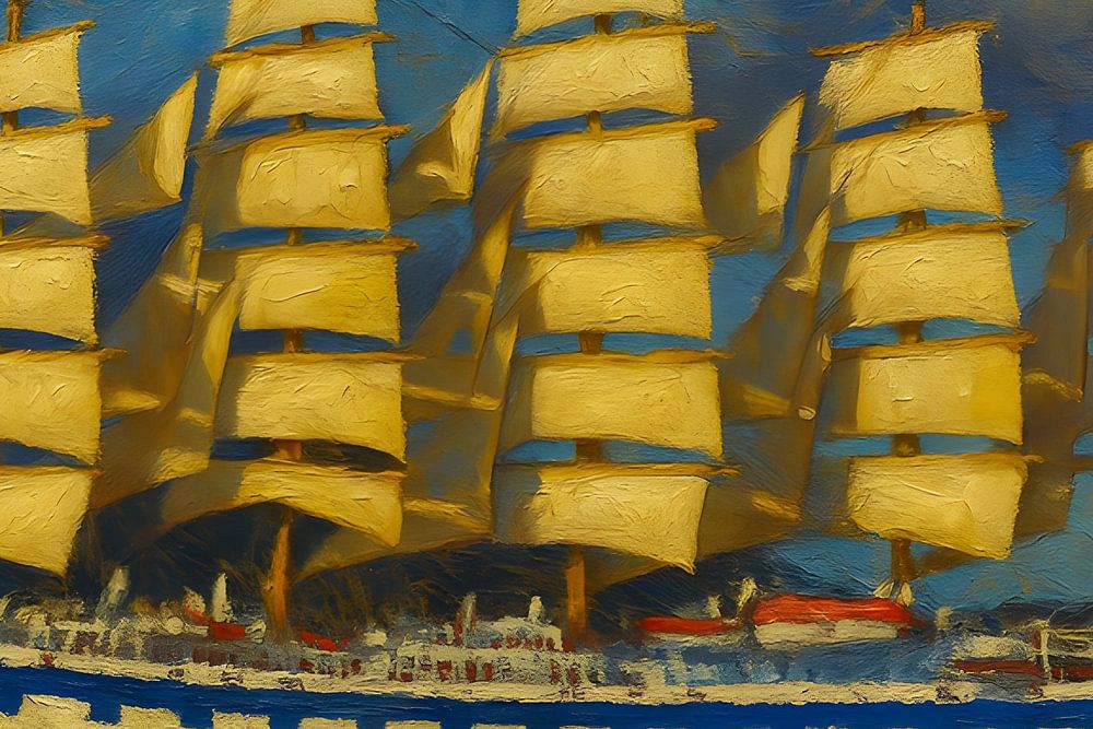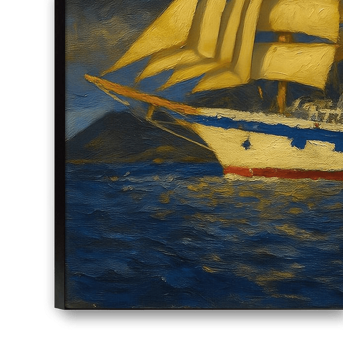 Dieses Ölgemälde stellt einen majestätischen Klipper dar, der in das warme Licht der untergehenden Sonne getaucht ist. Die imposanten Segel fangen das Gold des Abendhimmels ein, während das tiefe Blau des Meeres ein heiteres Gegenstück zu den hellen Tönen des Schiffs bildet. Jeder Pinselstrich atmet Bewegung - das Spiel von Wind und Wasser scheint fast hörbar, wie eine Symphonie von Freiheit und Abenteuer. Das Schiff, stolz und würdevoll, symbolisiert den menschlichen Drang zu entdecken, den Horizont zu erkunden und das Unbekannte zu umarmen. Der Künstler hat mit subtilen Licht- und Schattennuancen einen lebhaften Kontrast zwischen Kraft und Ruhe, zwischen den Turbulenzen der Natur und der Beherrschung durch den Menschen geschaffen. Dieses Werk ist nicht nur eine maritime Szene, sondern eine Ode an die zeitlose Schönheit des Segelns, des Träumens und des Reisens ohne Ende.