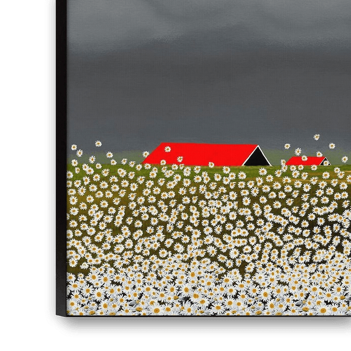 Ich habe die beiden unterschiedlichen Elemente digital zu einer sommerlichen Gewitterlandschaft kombiniert. Es ist ein Bild mit hohem Wiedererkennungswert für die Niederlande: die flache Landschaft, die Dächer der Bauernhöfe, die man in der Ferne sehen kann, der riesige Himmel und die Wolken und schließlich die fröhlichen, hellen Gänseblümchen.