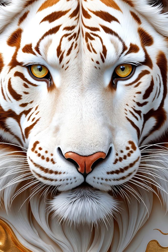 Ein Blick von durchdringender Klarheit trifft den Betrachter mit stiller Intensität. Das Antlitz des Tigers erscheint in makelloser Symmetrie, umrahmt von fließenden Strukturen aus Weiß und Gold, die wie lebendige Energie um ihn kreisen. Jede Linie des Fells, jede feine Nuance wirkt präzise und zugleich organisch, während die goldenen…