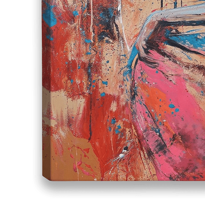 Tänzerin | Abstrakte Tänzerin - Dieses dynamische Kunstwerk fängt mit seiner lebhaften, kontrastreichen Farbpalette und dem energiegeladenen Look der Tänzerin die Essenz der urbanen Street Art ein. Der abstrakte Stil mischt kräftige Orange- und Rottöne mit blauen und schwarzen Sprenkeln, während die groben Pinselstriche und Spritzer ein…