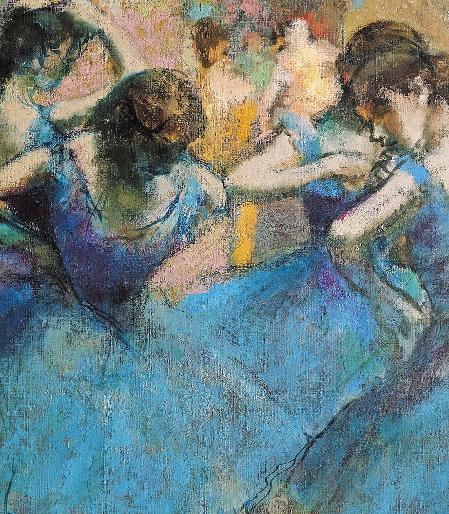 Degas' Tänzerinnen in Blau, gezeichnet in Pastell Anfang der 1890er Jahre, als das Sehvermögen des Künstlers rapide abnahm, ist eine bemerkenswert intime Wiedergabe der Energie und Bewegung dieser kleinen Gruppe von Ballerinen.