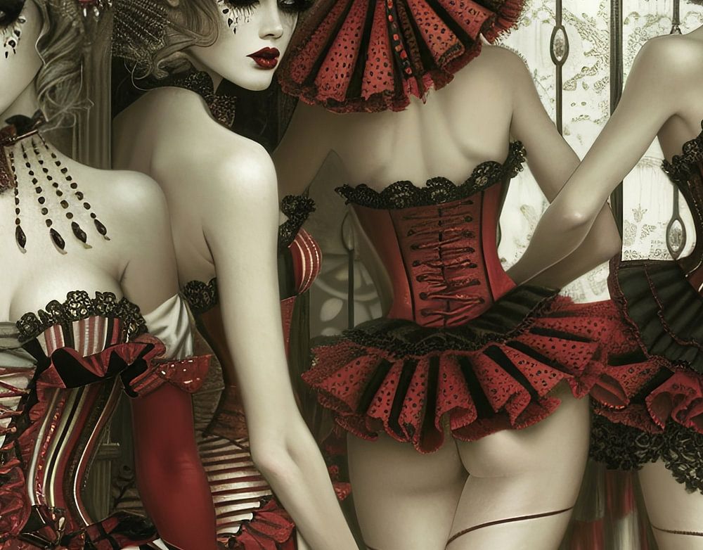 Digitales nostalgisches illustratives Bild von Frauen im Kabarett Boudoir-Stil Moulin Rouge Tanz