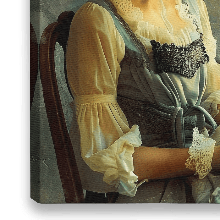 Ein fesselndes impressionistisches Gemälde einer jungen Frau, die scheinbar in Gedanken versunken an einem Fenster sitzt. Das Fenster zeigt eine verträumte, sonnenbeschienene Szene im Freien, in der ein Vogel anmutig durch den Himmel schwebt.