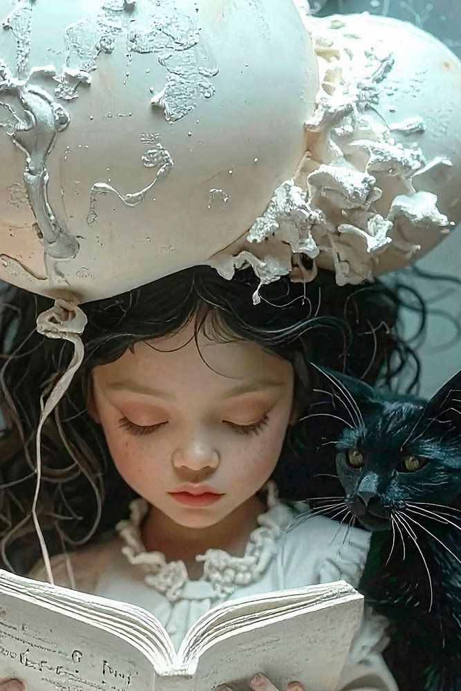 Ein süßes Mädchen liest ein Buch, neben ihr sitzt ihre schwarze Katze, über ihrem Kopf schweben zwei weiße Luftballons. Das Ganze sieht weiß, eisig, retro und versteinert oder aus Gips aus. Das Bild wurde mit ai erstellt.