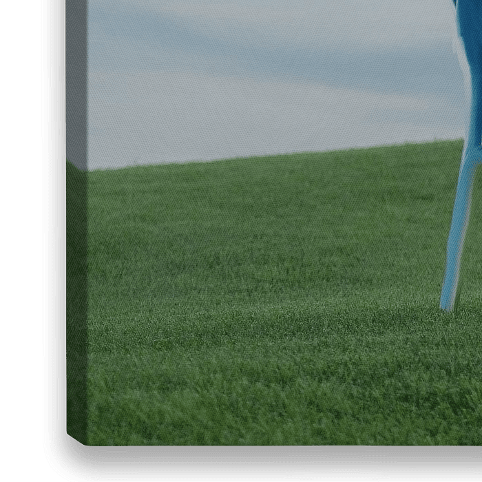 Eine Kombination aus Fotografie und digitaler Maltechnik mit dem Titel: daydreaming. Frau in Blau, auf einem Stuhl sitzend in hügeliger Graslandschaft