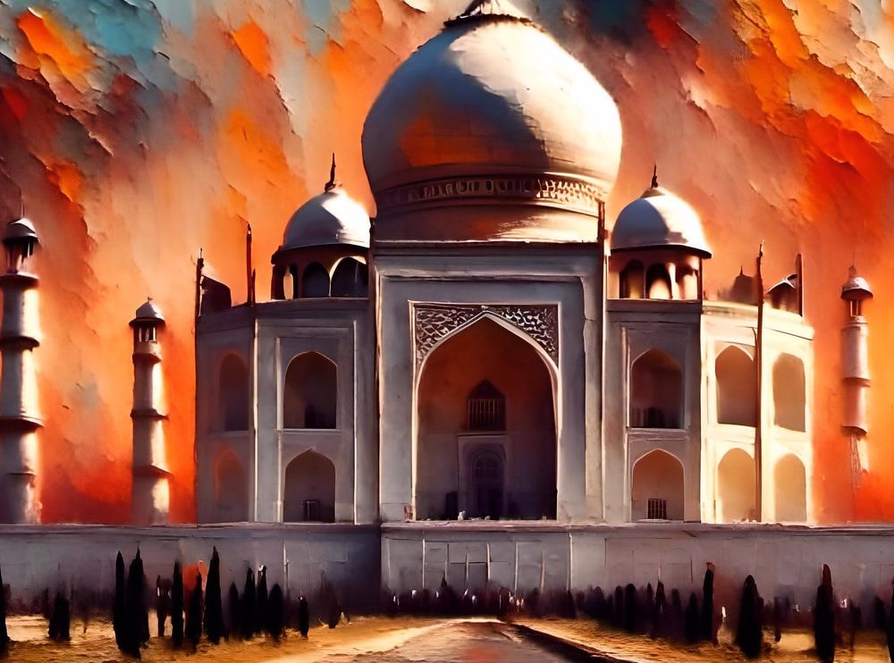 Entdecken Sie die bezaubernde Schönheit des Taj Mahal bei Sonnenuntergang mit diesem fesselnden Kunstwerk. Johannas meisterhaftes Werk fängt die Essenz Indiens ein. Ein Muss für Kunst- und Reiseliebhaber.