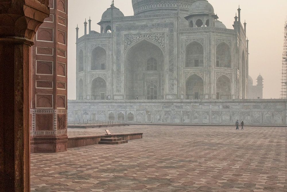 Taj Mahal direkt nach Sonnenaufgang. Es ist wegen der hohen Luftverschmutzung in der Region Agra schwer zu erkennen.