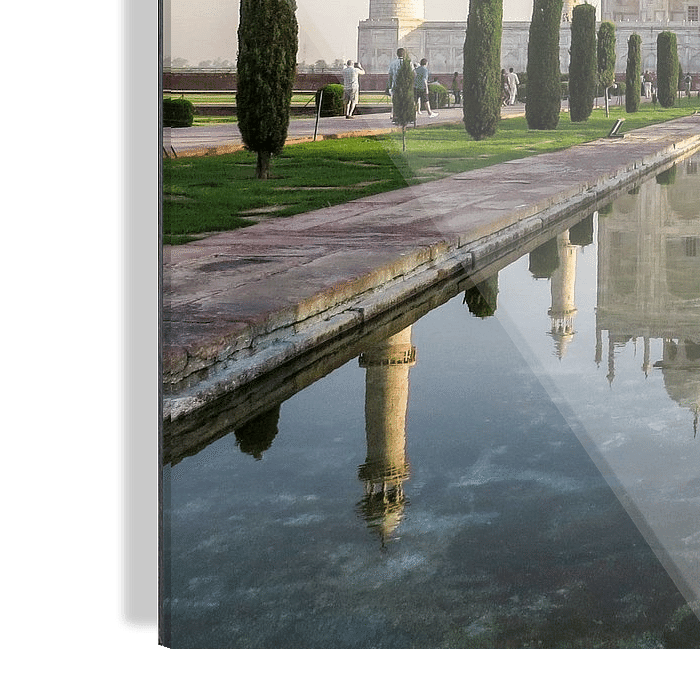 Das Taj Mahal in Indien im frühen Morgenlicht wird im Wasser des Gartenteichs reflektiert.