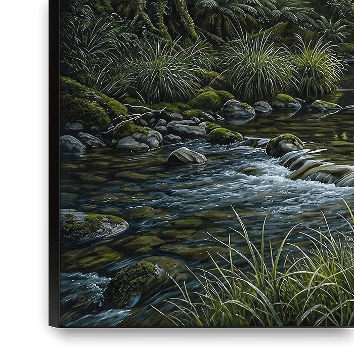 Eine atemberaubende Landschaftskomposition, die den Betrachter in ein unberührtes Tal entführt. Im Vordergrund fließt ein kristallklarer Fluss über moosbedeckte Steine, gesäumt von üppigem, farnreichem Urwald. Den Hintergrund dominieren majestätische, schneebedeckte Berggipfel, die in das sanfte, goldene Licht eines Sonnenaufgangs…