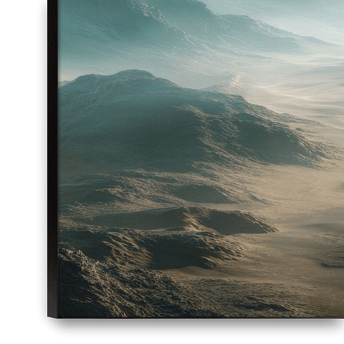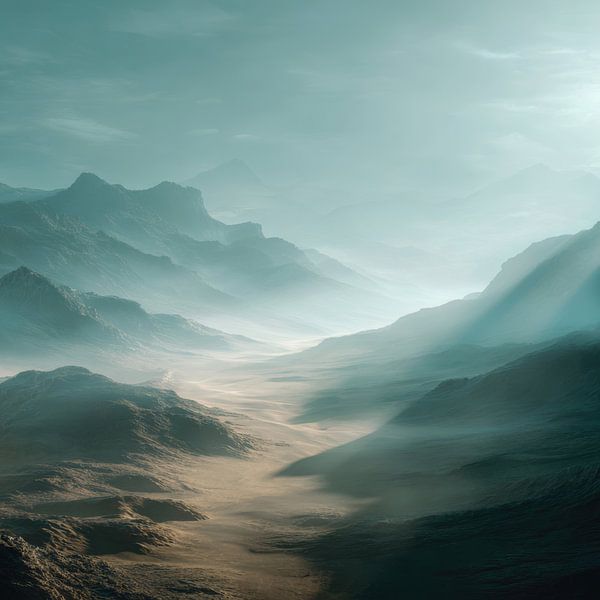 In dieser weiten Berglandschaft entfaltet sich ein stilles Tal, das in kühles, bläuliches Licht getaucht ist. Die Berge erheben sich in weichen Schichten aus dem Nebel, ihre Formen verblassen, je weiter sie sich dem Auge entziehen. Licht und Schatten gleiten über das Terrain und schaffen ein Gefühl von Tiefe und Raum zum Atmen. Die…