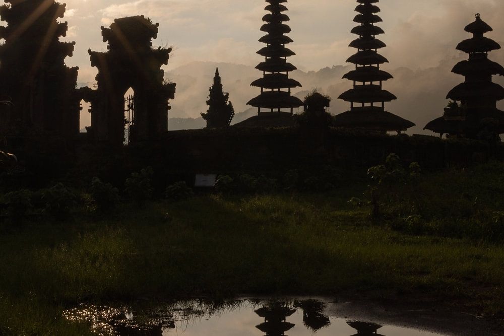 Eine bezaubernde Silhouette des Tamblingan-Tempels an einem ruhigen Bergsee auf Bali, eingefangen im sanften Licht des frühen Morgens. Die Konturen des Tempels heben sich scharf vom sich aufhellenden Himmel mit Flecken von Morgennebel ab, während ein flaches Becken im Vordergrund ein weiches, spiegelähnliches Echo seiner Struktur zeigt.