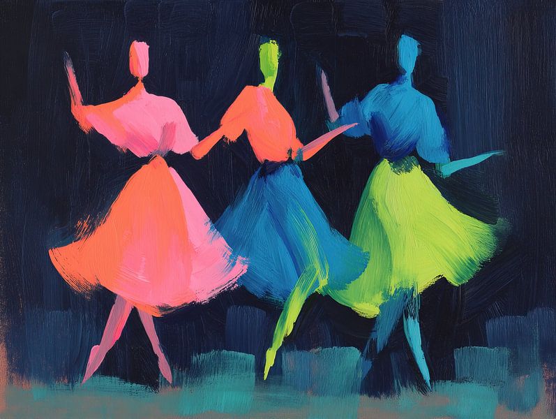 Tanzende Frauen | Vibrant Women in Motion – Dies ist ein Tanzgemälde mit drei lebhaften tanzenden Frauen in fröhlichen, leuchtenden Farben wie Rosa, Blau und Neongrün, die zusammen in einer energiegeladenen Komposition vor einem dunklen Hintergrund strahlen.