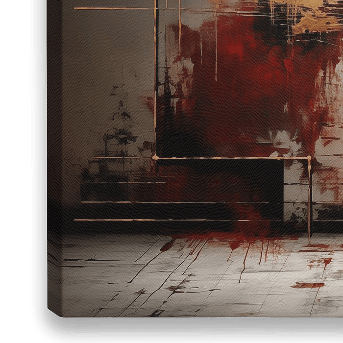 In diesem Werk entfaltet sich eine hypnotische Choreografie abstrakter Formen. Tiefes, intensives Rot schwebt wie ein ätherischer Schleier, unterbrochen von scharfen Linien, die sich wie geheime Pfade durch die Leinwand schlängeln. Geometrische Figuren, sowohl einfache als auch komplexe, schießen aus dem Zentrum hervor wie Fackeln, die…