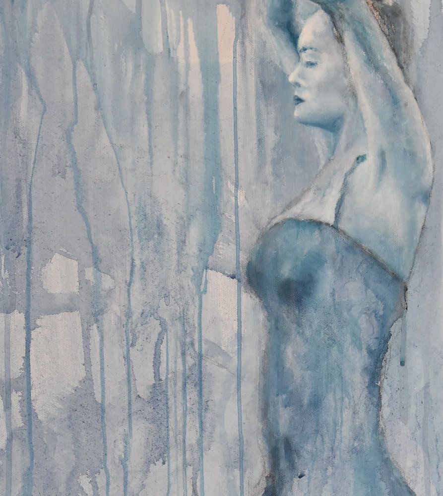 Gemälde einer tanzenden Frau im Regen. Monochromes Gemälde einer tanzenden Frau, die gleichsam in einem abstrakten Hintergrund verschwindet. Dieser abstrakte Hintergrund bildet gewissermaßen einen Regenschauer, in den die Tänzerin übergeht.