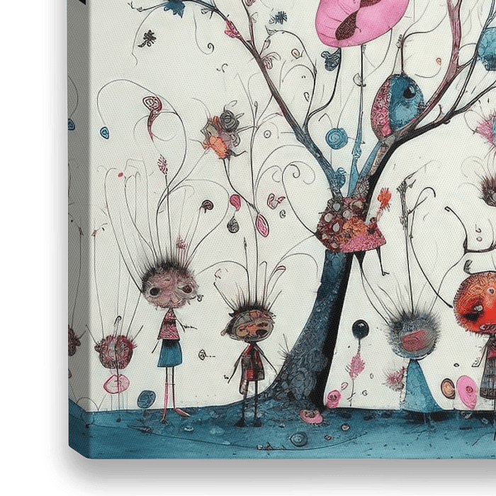 Die Szene ist mit Bäumen gefüllt, die keine gewöhnlichen Blätter tragen, sondern deren Äste mit ausdrucksstarken Gesichtern und lebendigen Mustern geschmückt sind. Diese Gesichter reichen von glücklich und lächelnd bis hin zu neugierig und überrascht, jedes…
