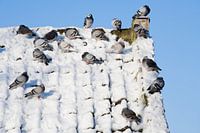 Bestelle dieses Vögel Wandbild Tauben auf einem verschneiten Dach von Peter de Kievith Fotografie als Kunstdruck auf Leinwand, Alu-Dibond, als Poster, Fototapete, ArtFrame oder Acrylglasbild, maßgefertigt in höchster Qualität.